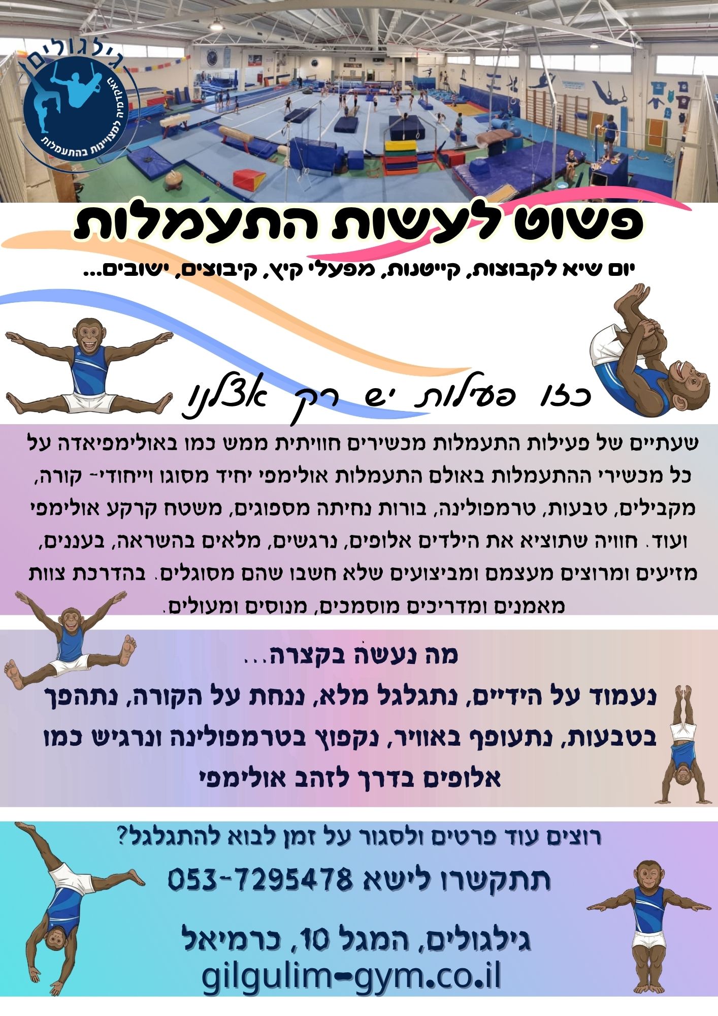 בגילגולים - האקדמיה למצויינות בהתעמלות בכרמיאל מסלולי אימון מגוונים המאפשרים חווית ספורט מעצימה לכל גיל ולכל המעוניין. בואו להתאמן איתנו ולגעת בשמיים. באולם ציוד ברמה אולימפית המאפשר התקדמות לרמות הגבוהות ביותר. באולם כל ילד/ה נהנים מציוד רב- קורות, מקבילי בנות, מתח, טבעות, משטח קרקע אולימפי קפיצי, טרמפולינה גדולה, שולחן קפיצות, מקבילי בנים, בורות נחיתה רכים ייחודיים ועוד.